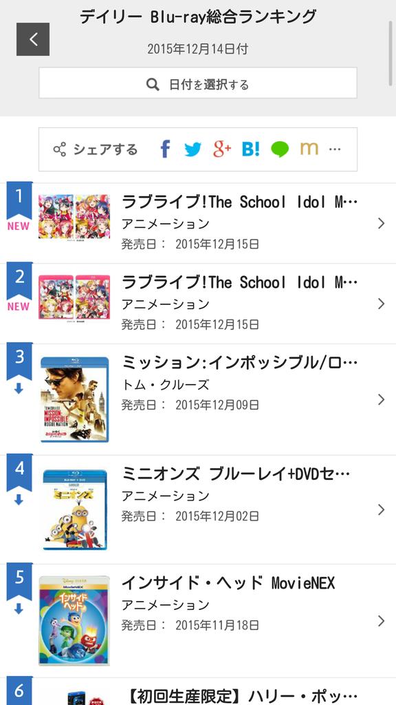 1위 러브라이브! 더 스쿨아이돌 무비 특장한정판 2위 러브라이브! 더 스쿨아이돌 무비 3위 미션임파서블 로그네이션 4위 미니언즈 5위 인사이드 아웃 이러다 진짜 20만장이 나올까요... 0