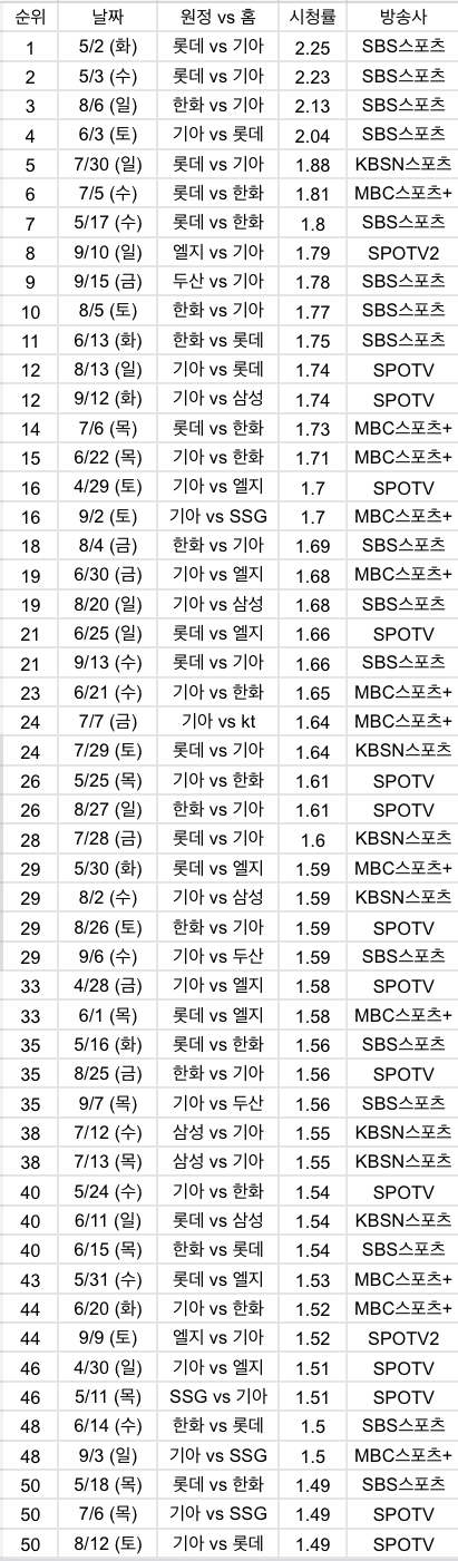 지난 몇년간 시청률 올킬하던 기아가 이제 37경기 뿐입니다.