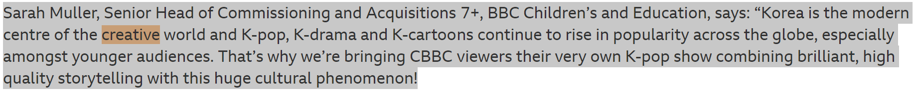 “한국은 창작 세계의 현대 중심지이며, K-팝, K-드라마, K-만화는 전 세계적으로, 특히 젊은 관객들 사이에서 계속해서 인기를 얻고 있습니다. 이것이 바로 우리가 CBBC 시청자들에게 뛰어난 수준의 스토리텔링과 이 거대한 문화 현상을 결합한 자신만의 K-pop 쇼를 제공하는 이유입니다! CBBC hits the K-pop charts with new drama series Gangnam Project https://www.bbc.com/mediacentre/cbbc-hits-the-k-pop-charts-with-new-drama-series-gangnam-project 제... 제가요?? 0