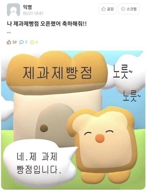 | Subject | 나 제과제빵점 오픈했어 축하해줘 |