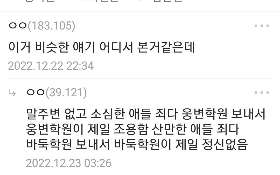 제가 어릴때 웅변학원 다녔는데 같은 반에 1~2명 정도 빼고 진짜 애들이 다들 소심하고 조용했읍니다 ㅋㅋㅋ 0