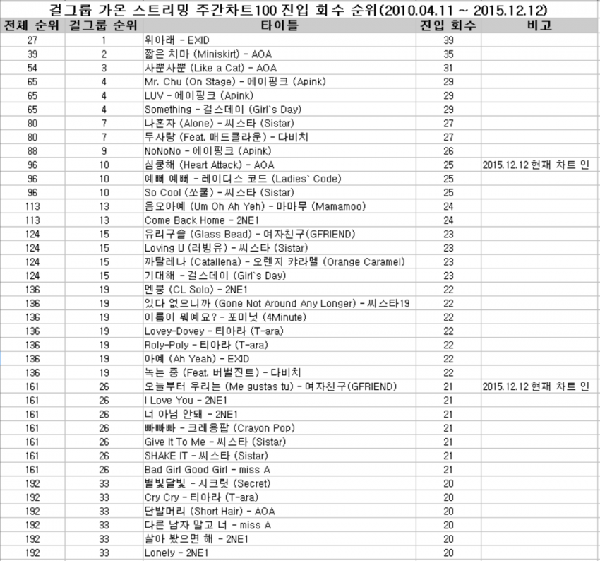 | Subject | 2010년 이후 걸그룹 음원 롱런 순위 |