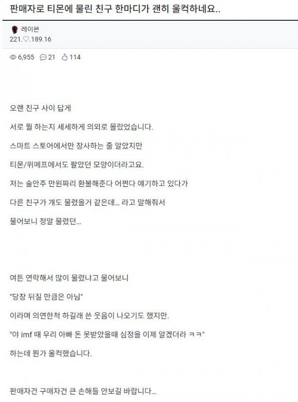 | Subject | 판매자로 티몬에 물린 친구 한마디가 울컥하네요.. |