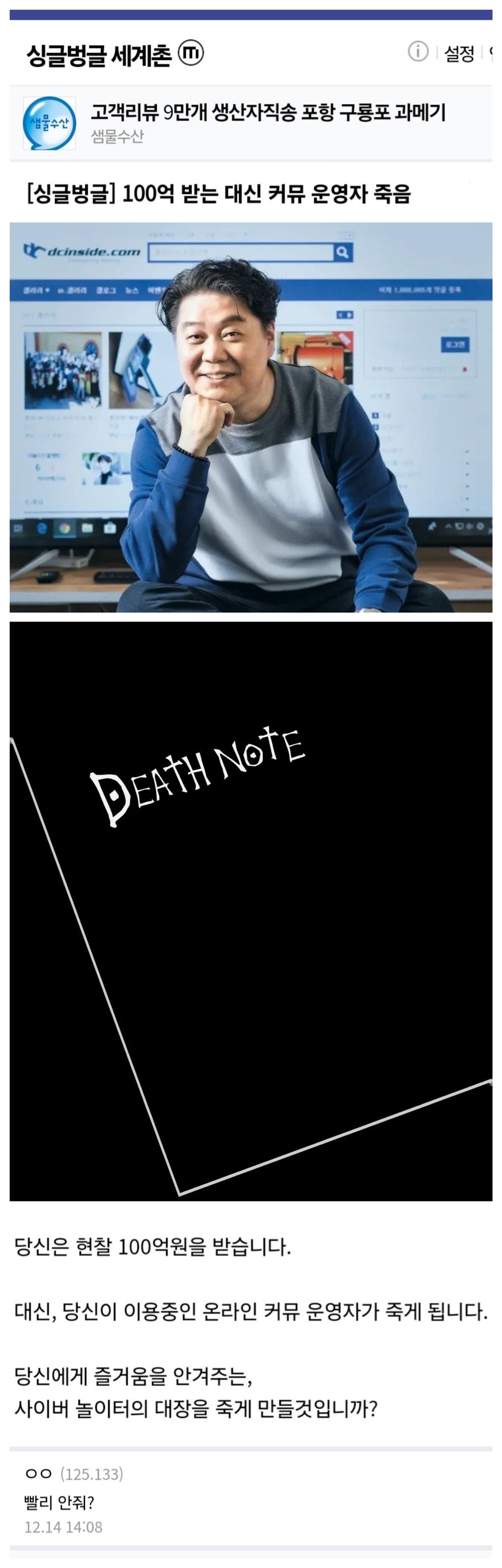 | Subject | 100억 받는 대신 커뮤 운영자 죽음 |