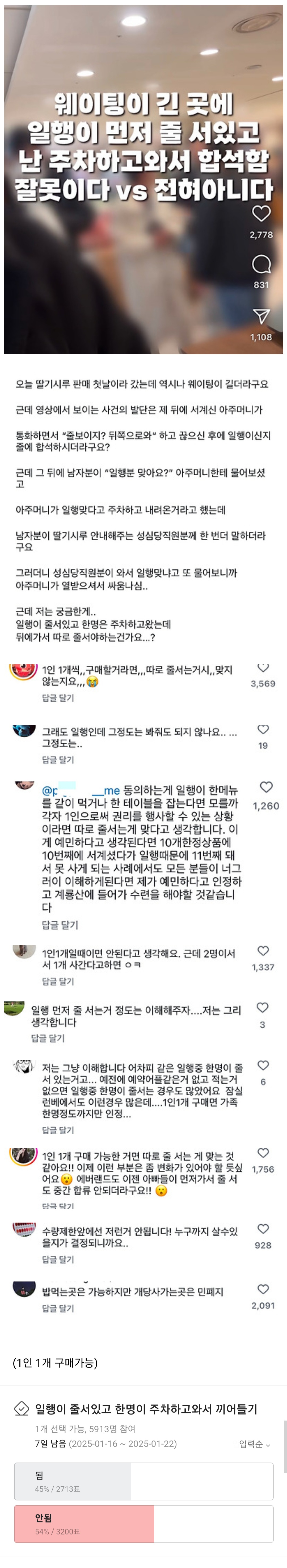 | Subject | 일행이 먼저 줄서있고 주차하고 나중에 합석 된다 vs 안된다 |