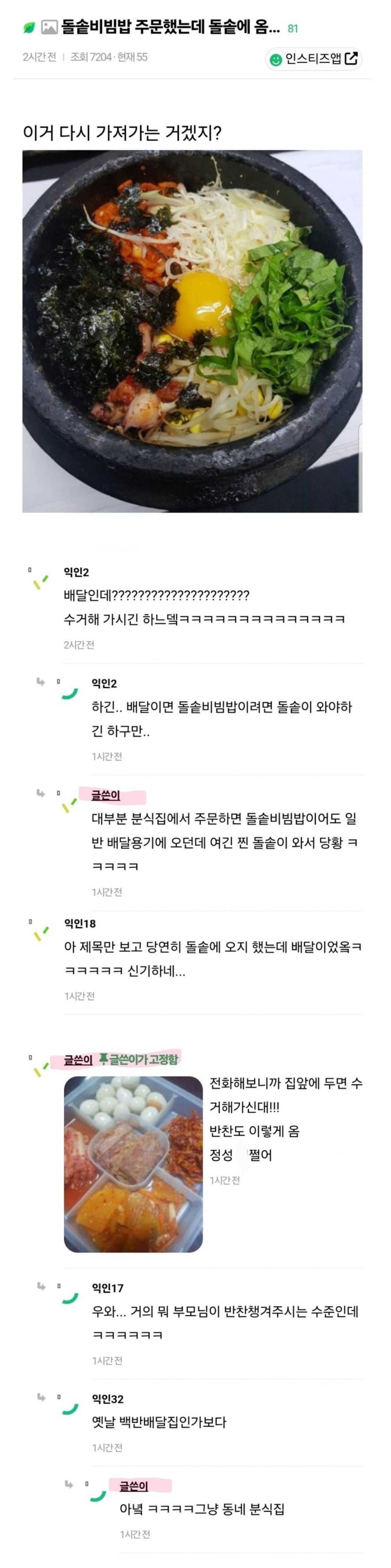 | Subject | 돌솥비빔밥 주문했는데 돌솥에 옴 |