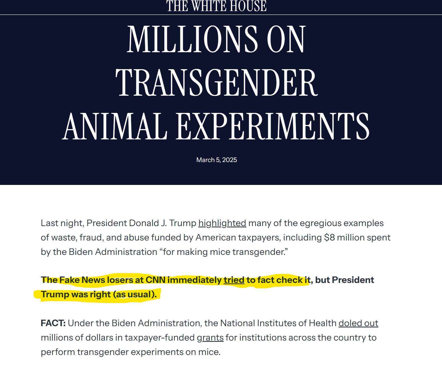 https://www.whitehouse.gov/articles/2025/03/yes-biden-spent-millions-on-transgender-animal-experiments/ 출처: 백악관 공식 홈페이지 1