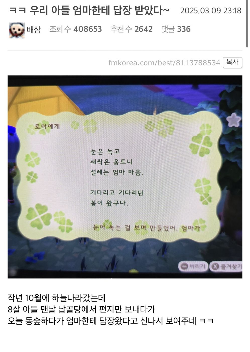 | Subject | 우리 아들 엄마한테 답장 받았다~ |