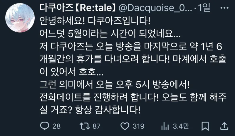 | Subject | 어느 한국 남성 버튜버의 휴방사유 |