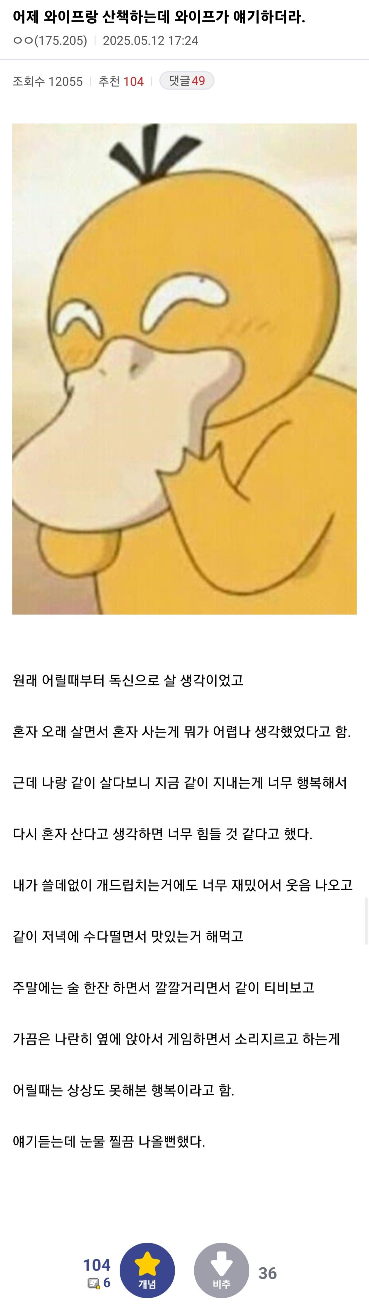 | Subject | 어제 와이프랑 산책하는데 와이프가 얘기하더라 |