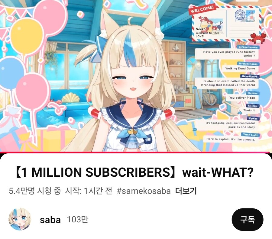 | Subject | 백만 구독자 신기록 쉰인 외국 버튜버 |