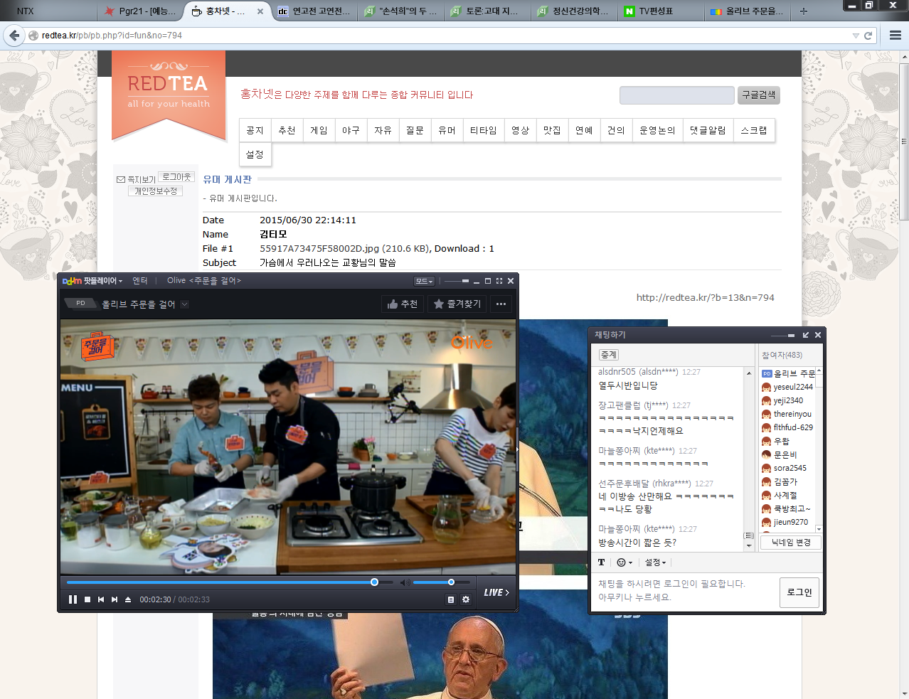 http://program.lifestyler.co.kr/olive/joomoon http://tv.kakao.com/l/18459691 사연자의 주문을 받아서 팟플레이어로 요리 과정을 중계한 뒤에 집까지 배달해주는 프로그램인데 결과물이 어떻게 나올지 기대되네요 그런데 방송 내용이 너무 어수선한게 함정. ps. 그나저나 어 스타일 포 유도 그렇고 이건 마리텔하고는 장르가 다른 것 같으니 마리텔 드립 자제좀... 0