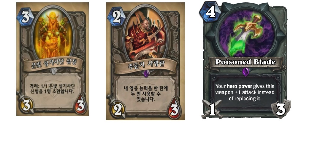 우측 한장은 브라질 방송에서 공개된 도적전용카드입니다. 이 칼을 찬 후 내 영웅 능력이 이 무기에 공격력 +1을 더해주는 걸로 바뀝니다.