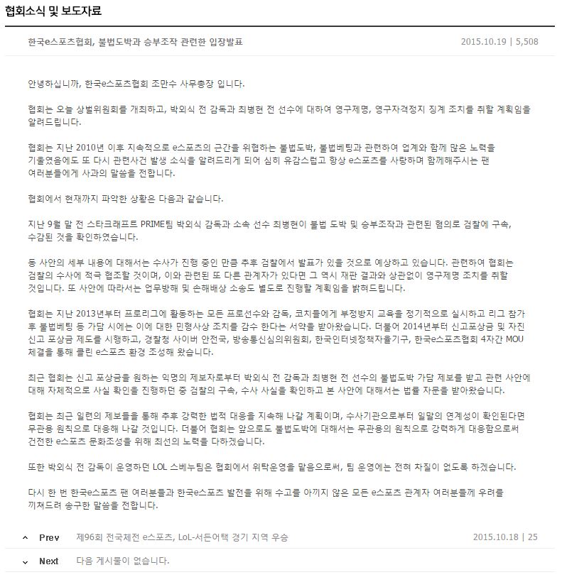 Subject   또다시 e스포츠 승부조작 사태가 발생하였습니다.
