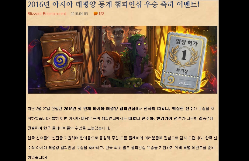 Subject   [하스스톤] 아시아 태평양 동계 챔피언십 우승 축하 이벤트가 있습니다.