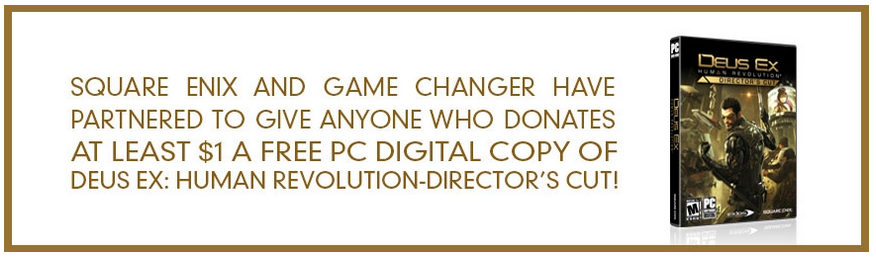 Deus Ex 15주년을 맞아 Game Changer 와 함께 기부행사로 $1 이상 기부하면 Deus Ex: Human Revolution - Director's Cut 를 줍니다.