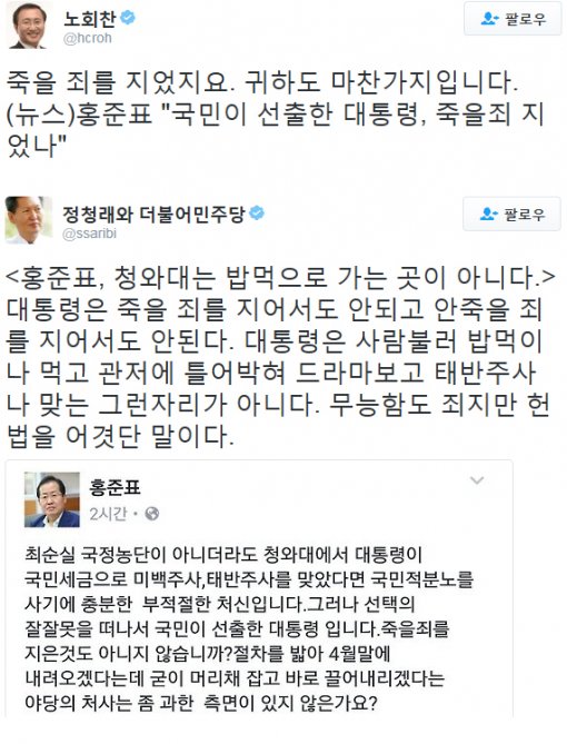 정치홍준표 "국민이 선출한 대통령, 죽을죄 지었나" 10 |