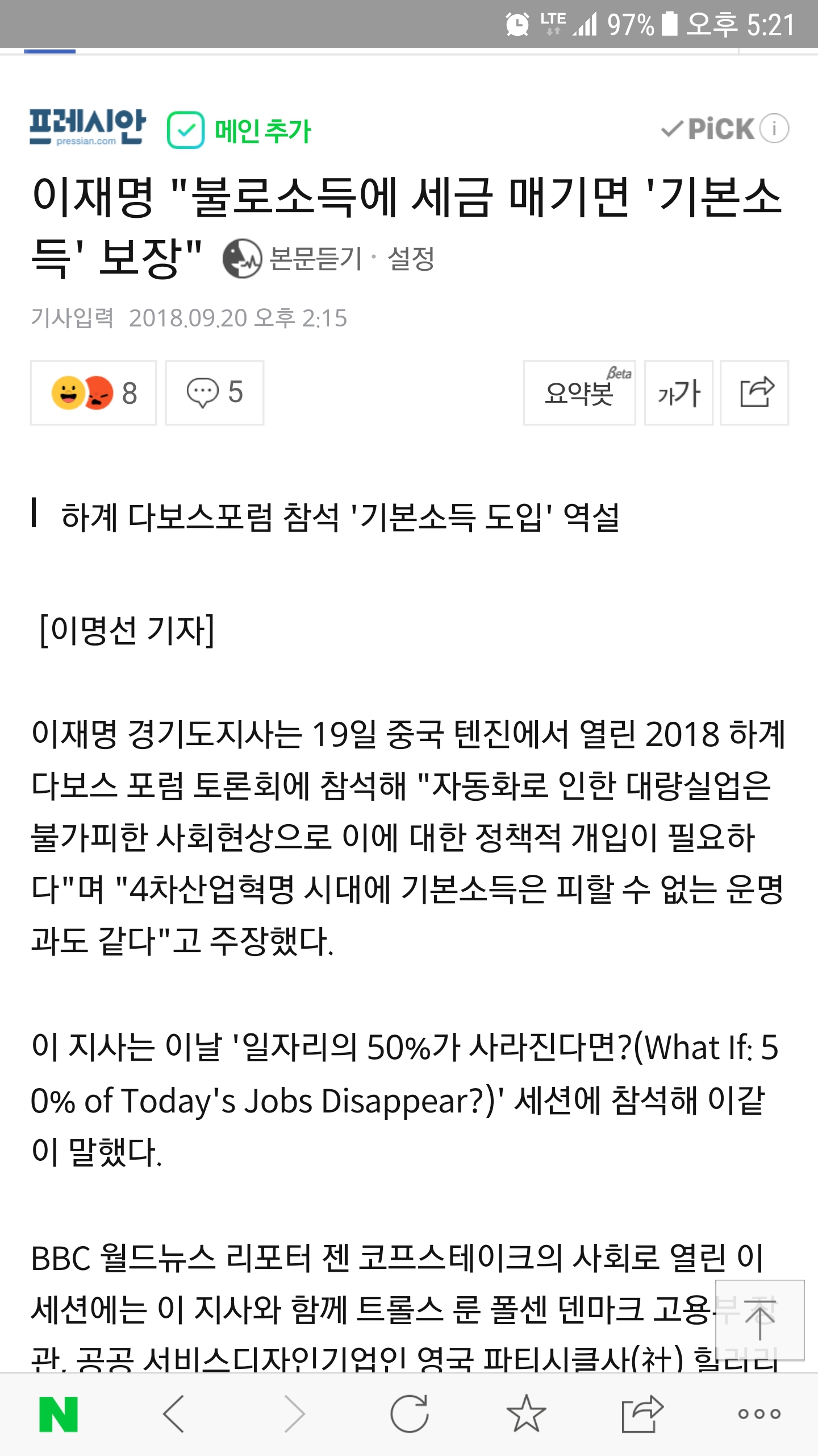 https://m.news.naver.com/read.nhn?mode=LSD&sid1=001&oid=002&aid=0002069124 저는 기본소득에 대해 찬성하는 입장입니다. 지금처럼 돈이 돈을 버는 세상에서는 사람이 농노와 지배계층으로 분화가 되지 않을 방법 중 하나라고 생각합니다. 대신 그 세원에 대해 어떻게 해야 하는지 관심있게 보고 있습니다. 이재명 경기도지사를 좋아하거나 지지하지 않지만 이 의견은 좋은 의견이라 생각합니다. 그런데, 가지고 있는 쪽에서 그 불로소득을 쉽게 준답니까? 혁명적인 일이 일어나도 겨우 조금 나눌까 말까 하는데요. ㅎㅎ 아직은 공상이 아닐지...요. 0