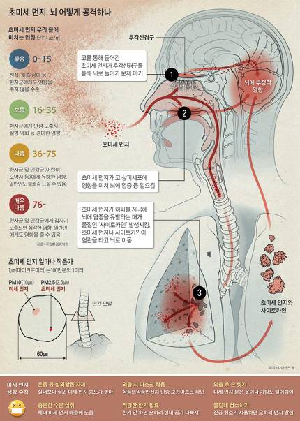 초미세 먼지가 뇌를 공격해 여러 질환을 일으키고 있다는 연구 결과가 연이어 발표되고 있다. 그동안 초미세 먼지가 기관지와 폐포에 도달해 염증을 일으키는 등 호흡기 계통에 좋지 않은 영향을 미친다는 연구는 많이 발표됐다. 그런데 최근에는 초미세 먼지가 코에서 바로 뇌로 들어가거나 혈관을 타고 뇌로 들어가 영향을 미친다는 연구 결과가 새로 나오고 있는 것이다. 서울대 의대 홍윤철 교수는 "초미세 먼지가 뇌졸중, 치매, 우울증 등 세 가지 질환을 다 유발한다는 연구 결과가 많다"며 "초미세 먼지가 뇌를 공격하는 것은 확실해 보인다"고 말했다.