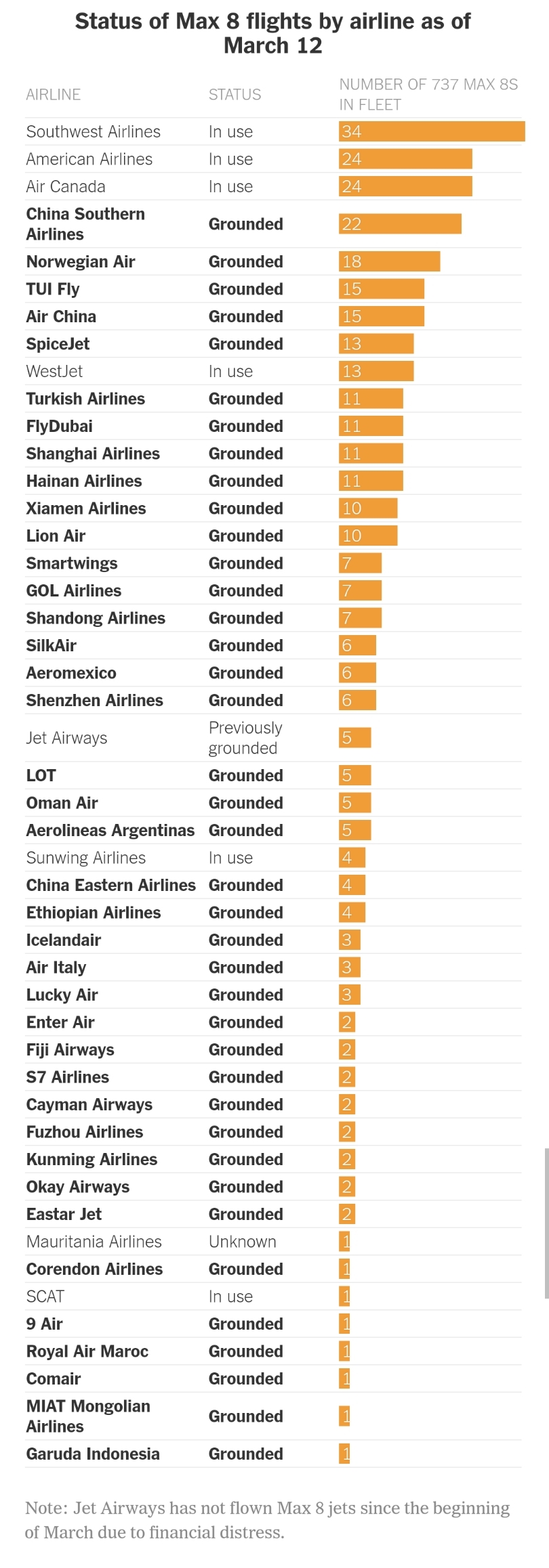 https://www.nytimes.com/interactive/2019/03/11/world/boeing-737-max-which-airlines.html 보잉 737 MAX 8이 북미와 일부를 제외한 거의 전세계에서 운항이 중단되었다고 합니다. 여전히 FAA는 운항을 허가하고 있지만, 우스꽝스러운 모양새가 되는건 피할수 없는것 같습니다. 조만간 도입예정인 대한항공등도 잘 판단했으면 좋겠습니다. 0