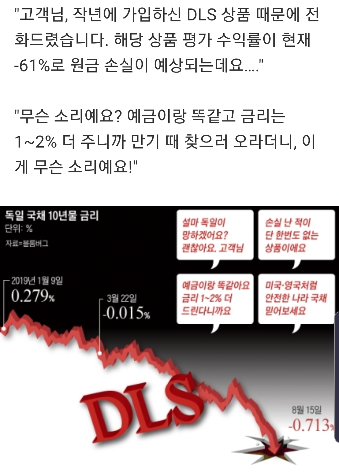 우리은행, KEB하나은행과 일부 증권사 등에서 작년 하반기부터 올 상반기 사이 약 1조원어치 판매한 금리 연계형 DLS가 현재 적게는 -40%, 많게는 -90% 이상 손실률을 기록 중이다. 주로 자산가들을 대상으로 판매했지만, 정부 고용보험기금도 585억원 투자했다가 477억원을 날렸다(수익률 -81%).