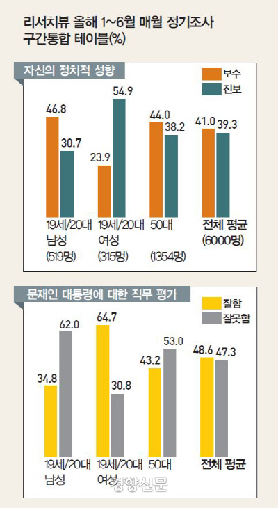 - 20대 남자와 20대 여자는 평균을 내는 것이 무의미할 정도로 정치적 성향이 크게 다르다.