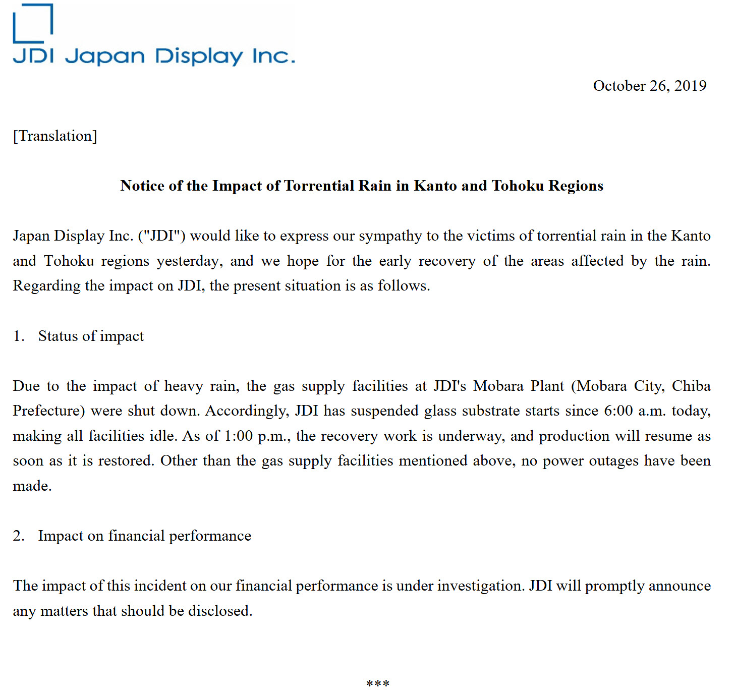 https://news.mt.co.kr/mtview.php?no=2019102711060694159 https://ssl4.eir-parts.net/doc/6740/tdnet/1759325/00.pdf 어려움을 겪고 있는 재팬디스플레이에 대한 애플 지원 소식이 얼마 전이었는데, 또 악재가 있네요. 최근의 폭우로 인한 피해가 여기까지 미치는군요. 단기간에 복구가 되는지는 현재로써는 잘 모르겠습니다. 0