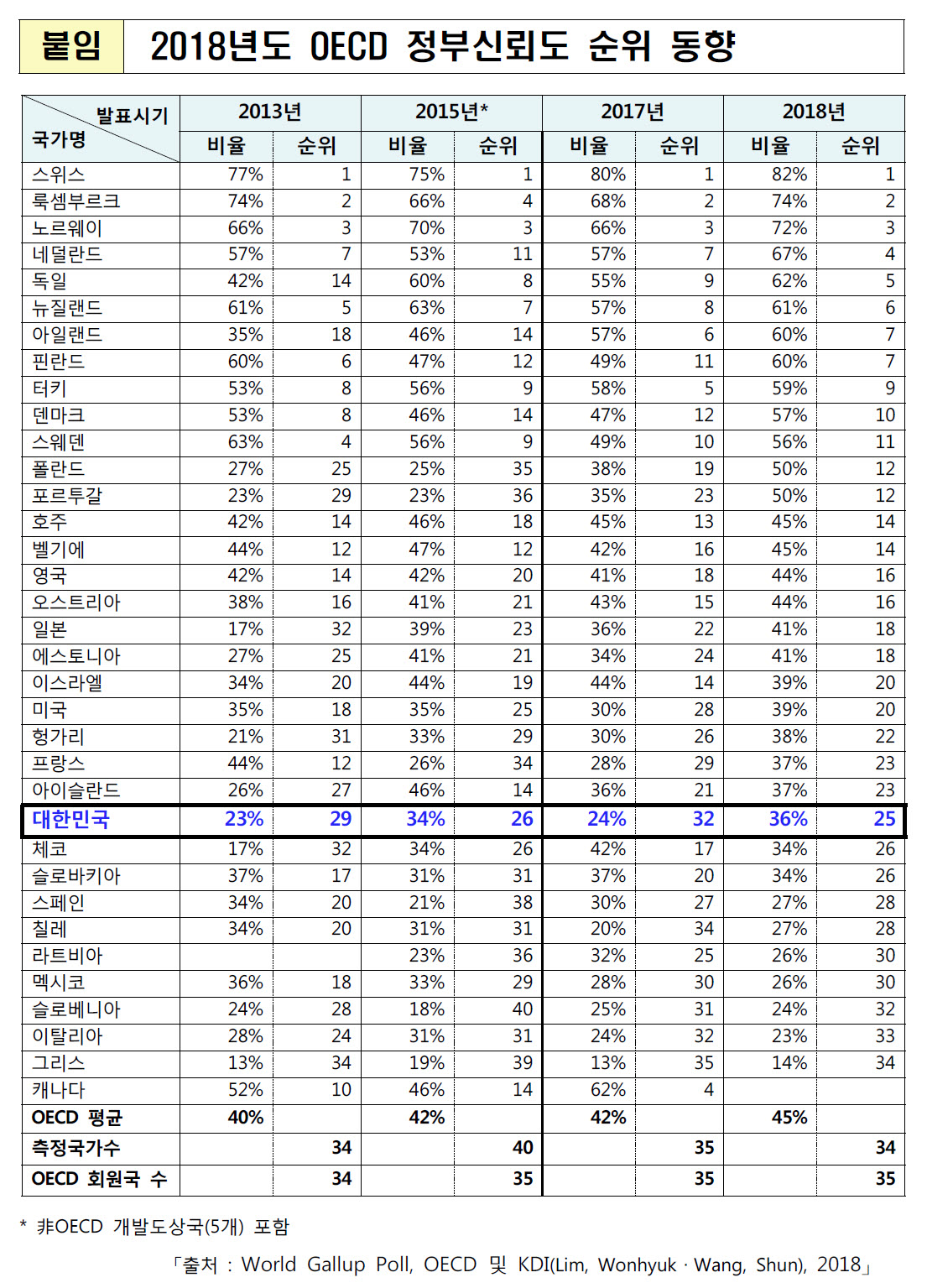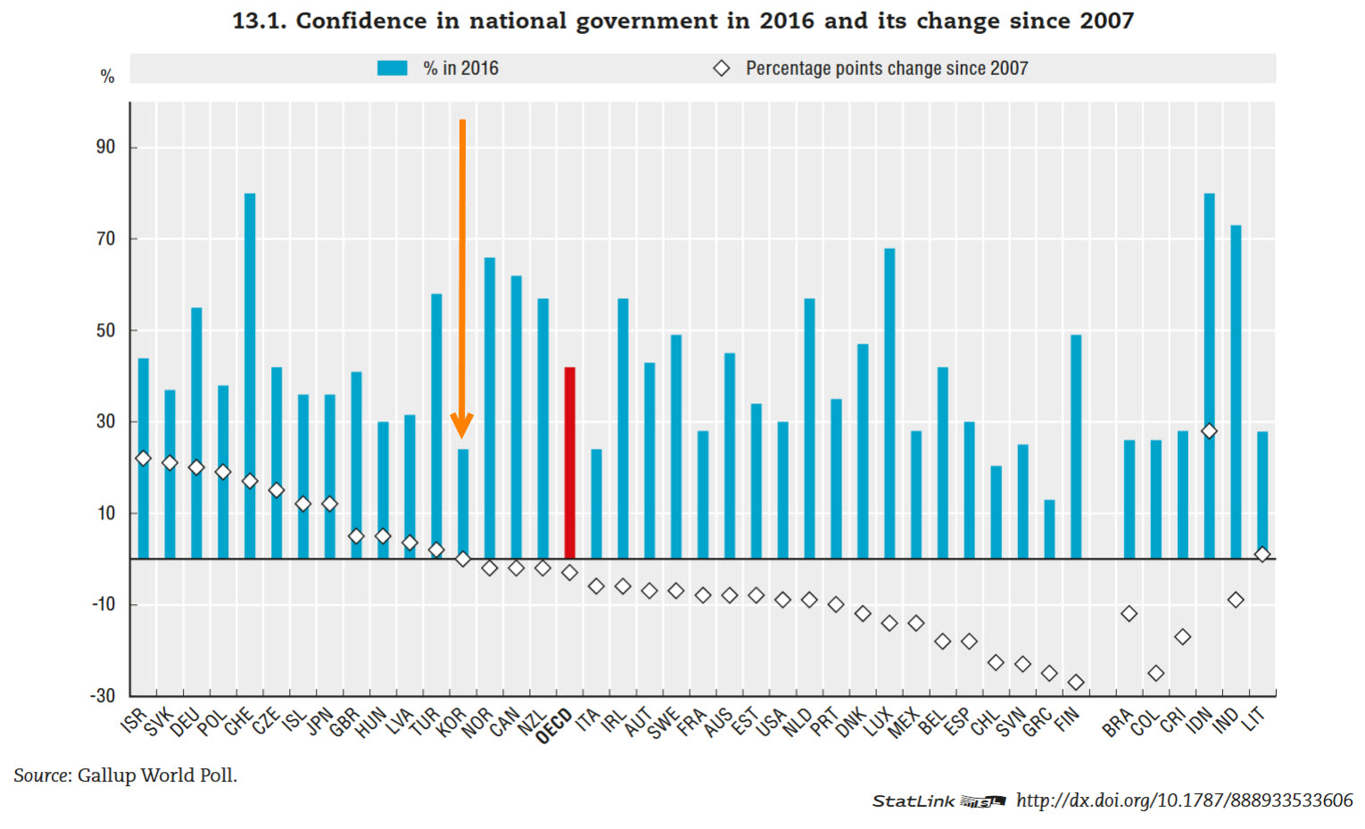 https://www.yna.co.kr/view/AKR20191031127500055 아빠 카드? 이런 문제들 때문에 앞으로 고교는 교사가 자녀와 같은 학교를 못 다니게 한다고 했죠.(상피제) 대도시가 아닌 곳은 자녀와 떨어져서 학교에 다니는 것 자체가 어렵다 보니, 평가 업무 등에서 배제하는 식으로 한다고 했고. 경영학도로서 이런 문제들은 시스템이나 프로세스를 고치는 방식으로 해결하는 것을 선호하는 편인데, 상피제가 그나마 가시적인 방법이라 해도 한계가 있을 것 같습니다. 전보를 보낸다고 해도 동료, 직원들과의 유대가 완전히 없어지는 것도 아니고. 사립 같은 경우는 특히나 다시 복귀할 사람이죠. 예전에도 비슷한 문제들이 있었을 법한데, 인터넷이 덜 대중화되어서인지 이렇게 전국적 이슈가 잘 안 되었던 것도 같습니다. OECD 정부신뢰도(갤럽 조사)는 위 표에 비해서 2018년에는 36%로 12% 포인트나 대폭 증가하기는 했습니다만, 아직 갈 길이 멀죠. [박노자의 한국, 안과 밖] 저신뢰 사회, 대한민국 http://www.hani.co.kr/arti/opinion/column/764111.html 어찌보면 누군가의 말처럼 권력에 대한 불신이 오래 쌓여온 것도 같은데, 교권의 추락을 말하지만, 한편으로 교사도 대입이 유난히 중요한 우리나라에서는 권력자인 것도 같습니다. 이런 저신뢰 사회는 어떻게 탈출할 수 있을까요? 에델만 신뢰 바로미터 2019 https://www.edelman.com/sites/g/files/aatuss191/files/2019-02/2019_Edelman_Trust_Barometer_Global_Report_2.pdf 일반 대중과 Informed Public을 구분해서 보여주는 것이 특징입니다. Informed Public: 전체 세계 인구의 16% 정도로, 대학교육을 받았고, 같은 나이대에서 해당 국가 상위 25% 가구소득에 들어가는 뉴스를 많이 소비하는 계층입니다. 우리나라는 두 계층간 신뢰 지수가 역대 최대치로 차이가 났습니다. 고용주에 대한 신뢰도는 전과 마찬가지로 최저였고, 기업에 대한 신뢰도도 러시아에 이어 낮았습니다. 1