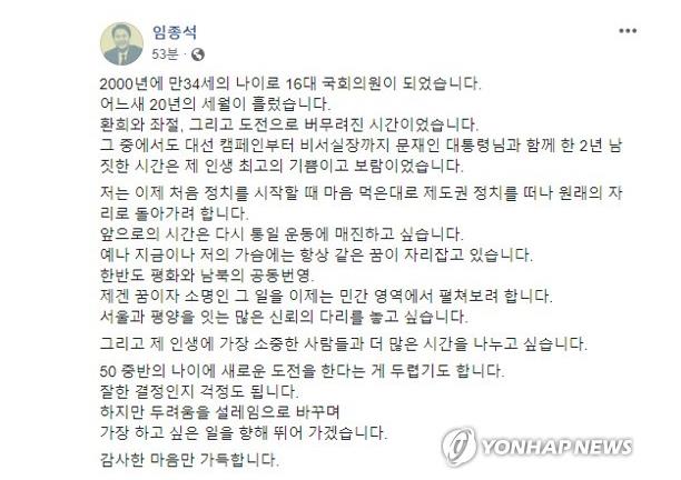 | Subject | 임종석 전 비서실장 정계은퇴 선언 |