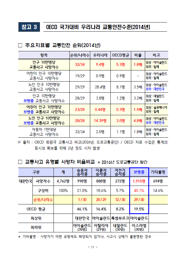 http://www.kgnews.co.kr/news/articleView.html?idxno=405345 [대부분의 노인 교통사고는 경로당, 마을주변 도로에서 길을 거닐다 일어난 사고들이 많다. 하지만 이곳에 노인보호구역 ‘실버존’이 있다는 것을 인식하고 있는 운전자나 보행자는 드물다. ‘실버존’이란, 노인들의 안전한 통행을 보장하기 위해 경로당, 양로원, 복지시설 등 노인들의 왕래가 잦은 도로에 어린이 보호구역인 ‘스쿨존’처럼 시속 30km제한 및 서행운전으로 교통사고의 위험으로부터 노인을 보호하기 위해 2008년부터 도입된 교통안전구역이다.] ------------------------------------------------------- 1년전, 4년전 뉴스. 파일2에 (안전개선과) 행정안전부 『보행안전 종합대책』 발표(외부) 17년자 내용 보시면 [* 노인 10만명당 보행 중 사망자 수 14.4명으로 28개국 중 28위(평균 3.0명의 4.8배) 어린이 10만명당 보행 중 사망자 수 0.44명으로 28개국 중 23위(평균 0.3명의 1.5배)] 라 하옵니다. 노인, 어린이 전체적으로 하위권이네요 0