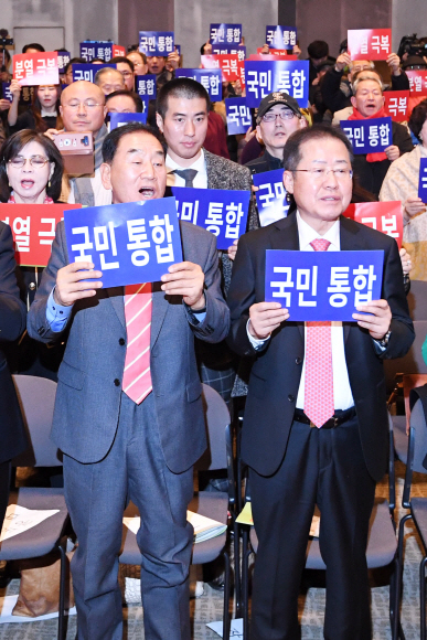 23일 서울 중구 프레스센터에서 열린 국민통합연대 창립대회에서 이재오(왼쪽) 창립준비위원장과 홍준표 전 자유한국당 대표가 참석자들과 피켓을 들고 ‘국민 통합’ 구호를 외치고 있다.박윤슬 기자 seul@seoul.co.kr