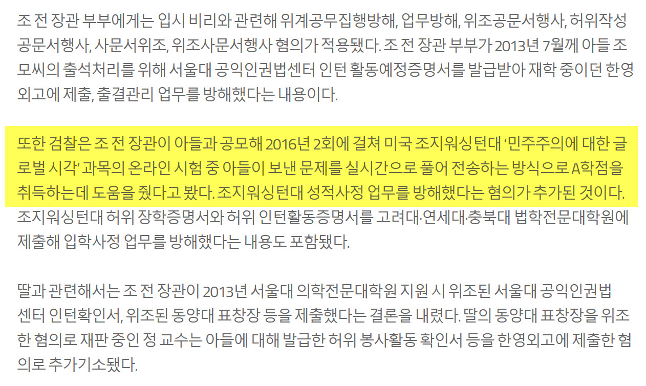 https://news.v.daum.net/v/20191231113447623 지난 8월말 수사 착수 넉 달만에 자녀입시비리 및 펀드 비리 혐의 부인은 9월과 11월 재판 넘겨져 검찰서 진술거부..법정공방 예고 검찰이 조국 전 법무부장관을 자녀 입시비리 및 사모펀드 비리 관련 혐의 등으로 재판에 넘겼다. 지난 8월말 조 전 장관 일가 의혹 수사에 착수한지 넉 달만이다. 31일 검찰에 따르면 서울중앙지검 반부패수사2부(부장검사 고형곤)는 이날 뇌물수수 및 공직자윤리법 위반 등 총 12개 혐의를 적용해 조 전 장관을 불구속 기소했다. 이와 함께 공직자윤리법 위반 등 혐의로 조 전 장관의 부인 정경심 동양대 교수를 추가 기소했다. 검찰이 조국을 불구속기소했습니다. 적용한 혐의는 12개가 됩니다. 2