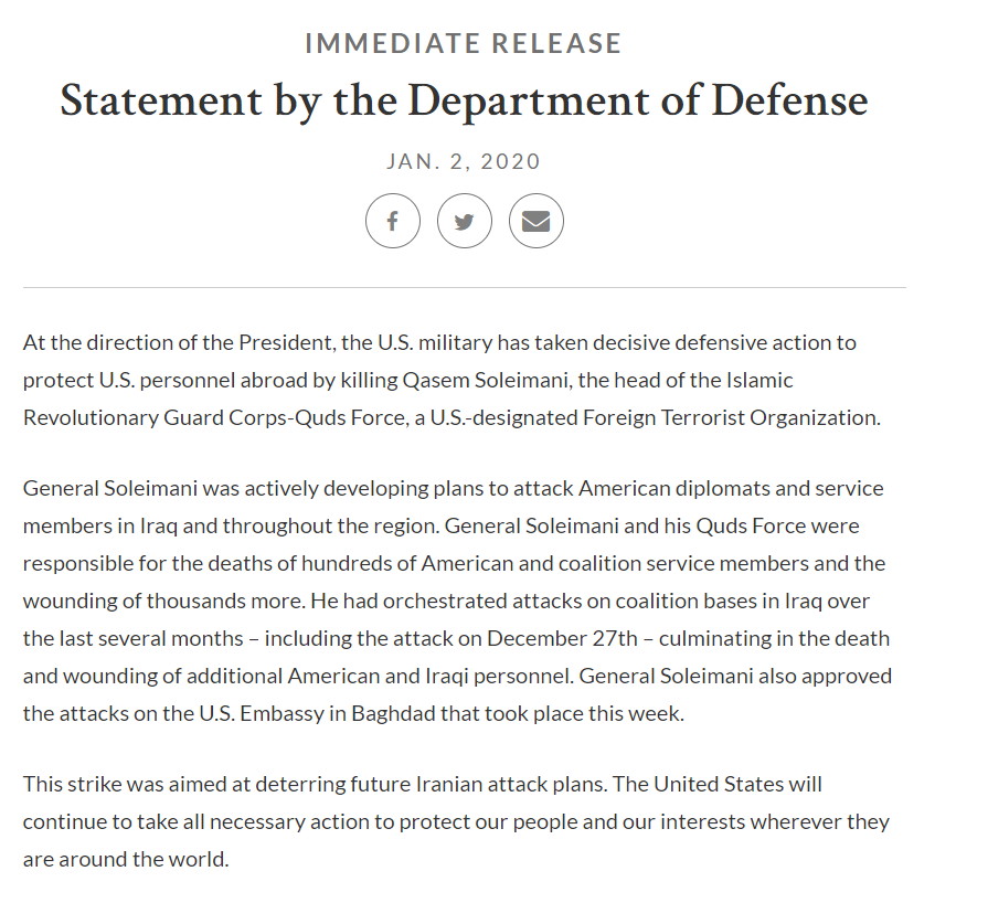 | Subject | 바그다드 공항 공습으로 이란 군부실세 카심 솔레이마니 사망 |