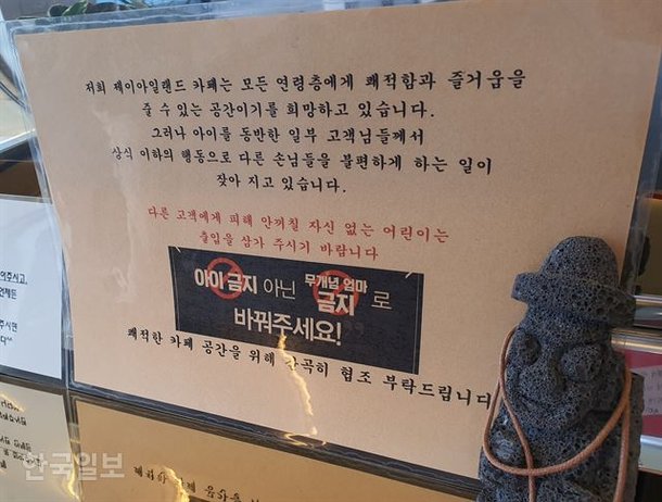 저는 개인적으로 노 키즈 존이 감정적으로는 덜 화나는거 같아요 ㅋㅋㅋ 노 키즈 존은 '구린 목표를 위한 구린 수단'이잖아요. 이건 근데 '좋은 목표를 위한 구린 수단' 같아서 좀 더 거부감이 들어요. 노 키즈 존은 '애 데리고 들어오지마라' 라는 애초에 미사여구로 포장해주기 힘든 목적이니 그 수단이 저렇게 극단적일수밖에 없지만 본문의 경우 결국 '애 관리 잘해라' 라는 뜻인데 이걸 꼭 저렇게 나쁘게 표현해야 할까요.