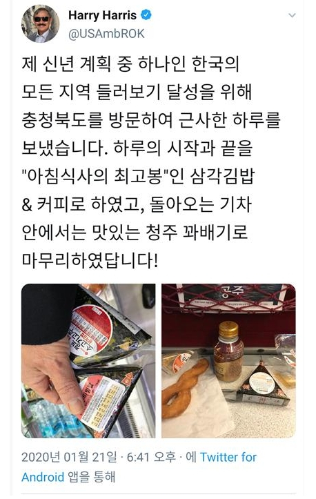 | Subject | 충북 다녀온 해리스 美대사 "아침식사 최고봉은 삼각김밥·커피" |