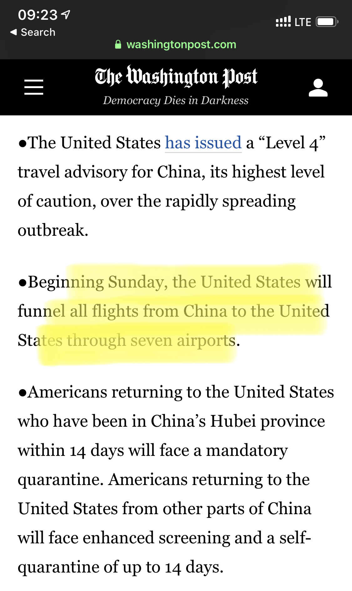 미국은 국내공중보건 비상사태선포, 국무부 여행 금지 최고 단계 (4단계), 모든 국적기 중국 항공편 중지에 입국거부까지 예고하였습니다.
