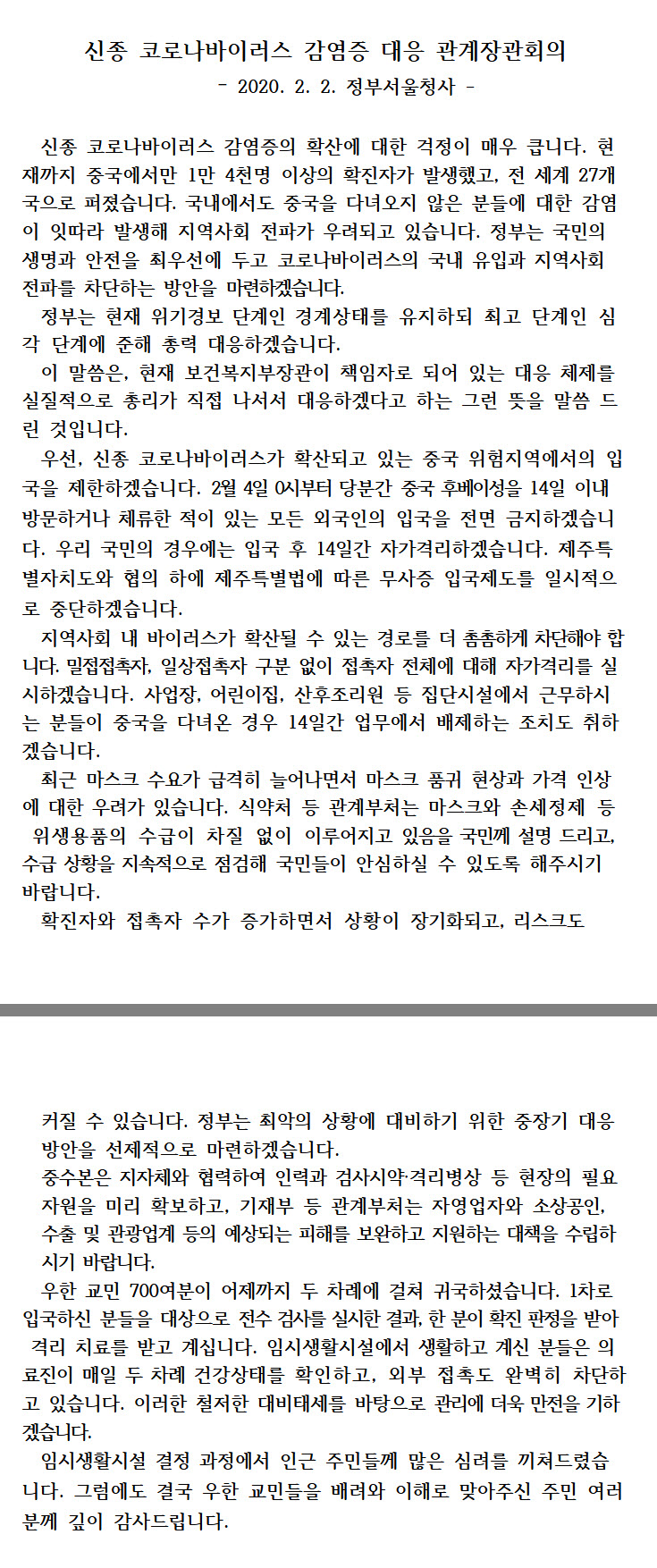 https://www.yna.co.kr/view/AKR20200202041400001 총리모두발언 http://www.opm.go.kr/flexer/view.do?ftype=hwp&attachNo=96330 보도자료 https://www.mohw.go.kr/react/al/sal0301vw.jsp?PAR_MENU_ID=04&MENU_ID=0403&page=1&CONT_SEQ=352649 https://youtu.be/1XGqNNHVbXk 늦은 감이 있지만, 일단 다른 선진국들보다 조금 약한 선으로 가는 것 같습니다. 원래 언론 브리핑은 오후 5시에 예정되어 있는 것으로 압니다. 보건 안전 수준이 우리나라보다 많이 떨어지는 곳들은 갑자기 전면 입국 금지하는 곳들도 있었죠. 오늘 뉴질랜드의 경우 https://www.yna.co.kr/view/AKR20200202038700009 다른 주요국, 항공사들의 경우 (토, 일요일 상황) 미국 :미국 동부 시간으로 일요일 오후 5시부터 2주내 중국(전역) 방문자는 미국 시민/영주권자 제외하고 입국금지. 후베이성에서 귀국자는 미군이 제공하는 시설에서 14일 격리. 미국 델타 항공 :2월 6일부터 4월 30일까지 중국 항공편 운항 중단 미국 AA :토요일부터 3월 27일까지 중국 항공편 운항 중단 *두 항공사는 그 이전에 파일럿 협의체와 협의해서 조종사가 중국행 항공편 탑승을 거부할 수 있도록 한 바 있습니다. 호주, 이스라엘 :미국과 유사한 내용 토요일 발표. 호주 콴타스 항공 :2월 9일부터 중국 직항편 2개 중단 베트남 :중국과 항공 연결편 즉시 중단 발표 (국영 배트남 항공과 저가 항공사 젯스타 퍼시픽은 홍콩과 타이완 연결편도 중단) 이탈리아 :EU국가 중 처음으로 중국발 항공기 도착 금지 카타르 항공 :중동 주요 항공사 처음으로 중국행 항공기 운항 중단 필린핀 세부 항공 :일요일부터 3월 29일까지 중국편 운항 중단 파푸아 뉴 기니 :보건 안전 위협에 대응할 여력이 별로 없어서, 중국 뿐 아니라 아시아 전역에서 오는 비행기와 배의 입항을 금지. 유일한 육로 연결 국경도 닫음. 대만 :2일부터 광둥성 지역민 대만 입경 금지 추가 조치 ==== 전에 따로 전했던 내용. 싱가포르 :1월 31일에 14일 이내 체류자 포함 모든 중국발 방문객 입국 금지 발표를 했고, 입국 금지 조치는 어젯밤 23:59에 시행되었습니다. 일본 :14일 이내 후베이성 체류 외국인을 2월 1일 0시부터 입국 거부하는 것을 31일 발표했습니다. https://m.yna.co.kr/view/AKR20200202046400083 https://www.yna.co.kr/view/AKR20200202013951009 (나중에 업데이트 하겠습니다. 클라우드 문제가 생겨서 인터넷 대역폭을 다 잡아먹고 있었네요) 3