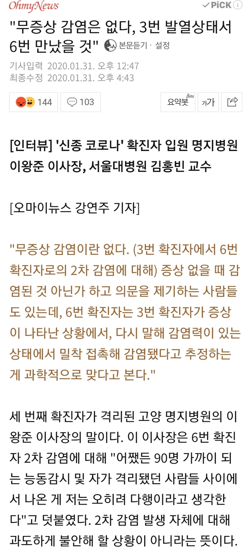 Subject   당국 ‘무증상 감염’ 가능성 인정 “전파가능성 크다”