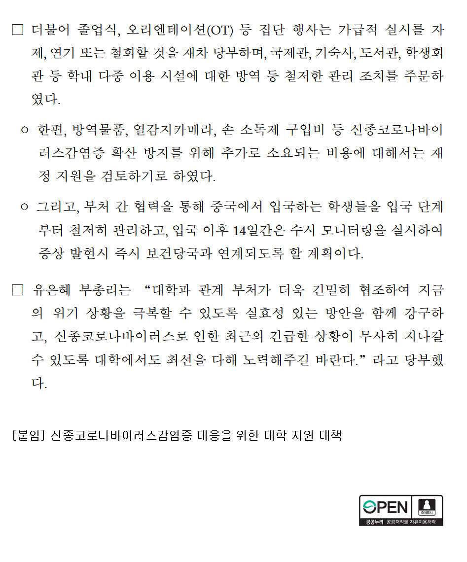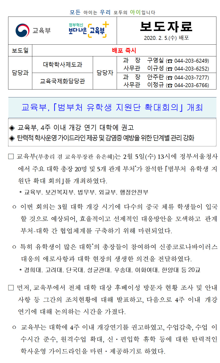 교육부에서는 신/편입색 첫학기 휴학이 가능하도록 대학에 권고하고, 온라인 수업 등 원격 수업 적극 활용, 학사일정 축소 등의 탄력적 학사운영 가이드라인을 제시했습니다.