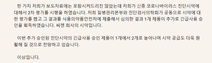 기존에는 코젠 바이오텍 진단시약을 한시적 승인해서 써오고 있었습니다.