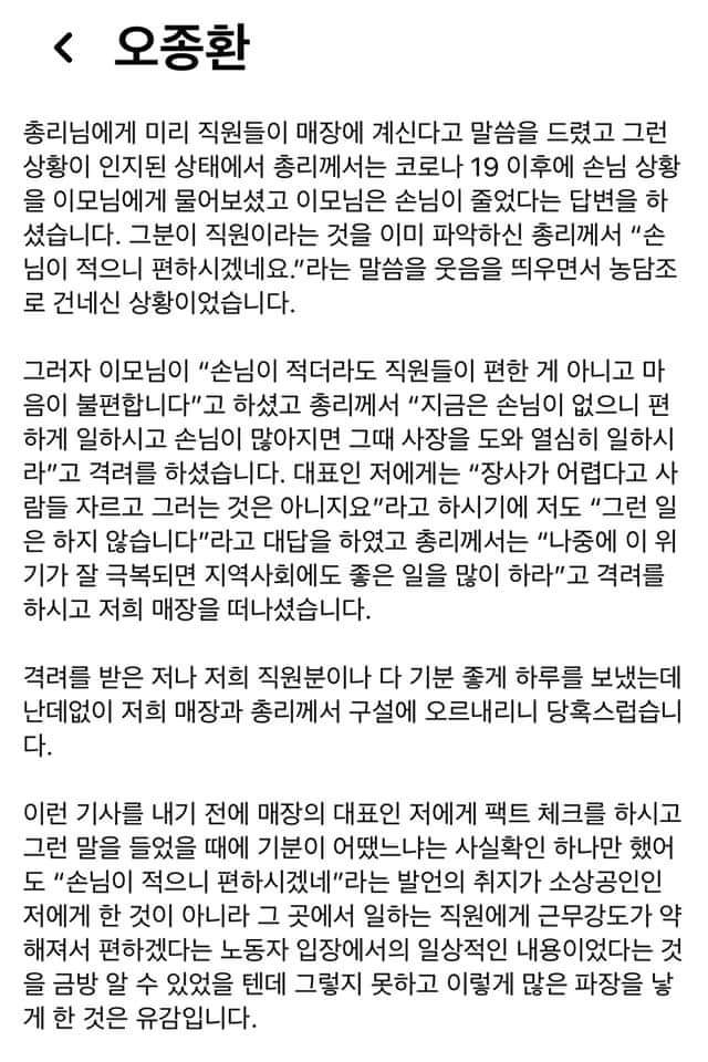 가게 사장이 정세균 총리를 모시고 들어가 종업원 이모님을 소개했고, 총리는 사장을 의식한 상태로 종업원에게 문제의 편하시겠네 - 마음이 안 편해요 - 곧 손님 많아질 거다 주거니 받거니 대화를 했고, 전체 맥락 속에서 사장과 종업원은 '격려를 받았다' 생각하고 기분이 좋았는데, 오히려 기자들의 악의적인 선동에 이용되어 유감이라고 하고 있죠.