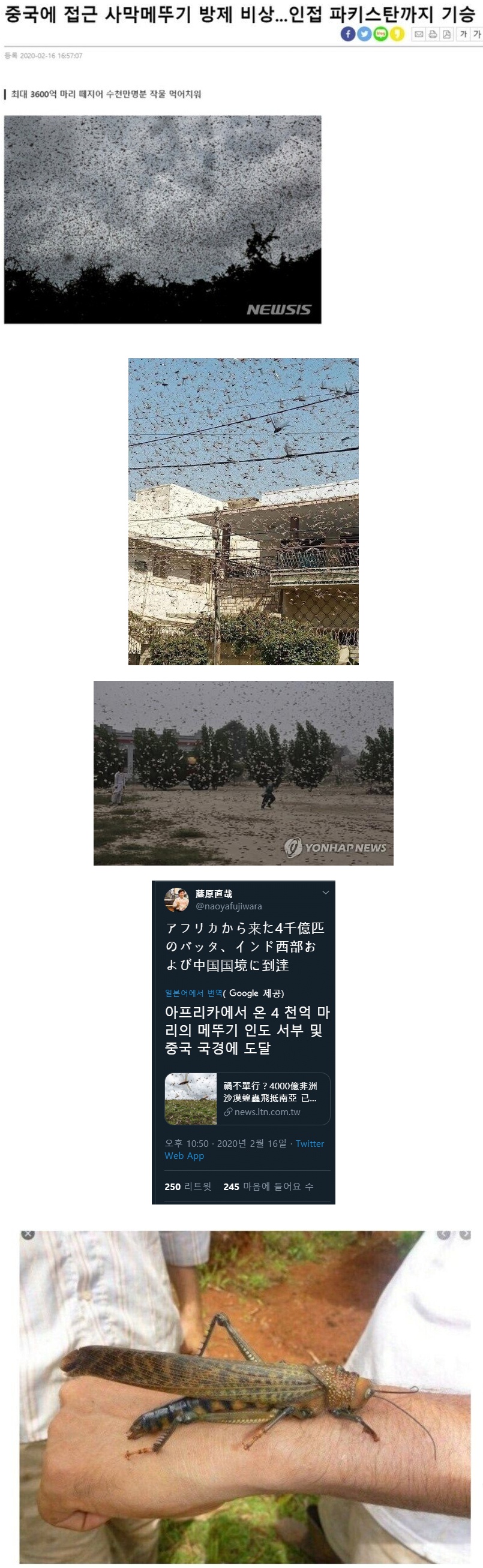 | Subject | 중국에 접근 사막메뚜기 방제 비상...인접 파키스탄까지 기승(기사 추가) |