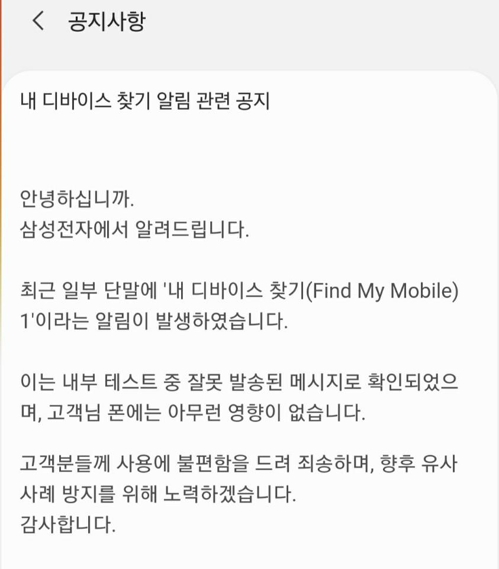 IT/컴퓨터삼성폰 '내 디바이스 찾기' 알림 오류…"테스트중 잘못 발송" 1 |