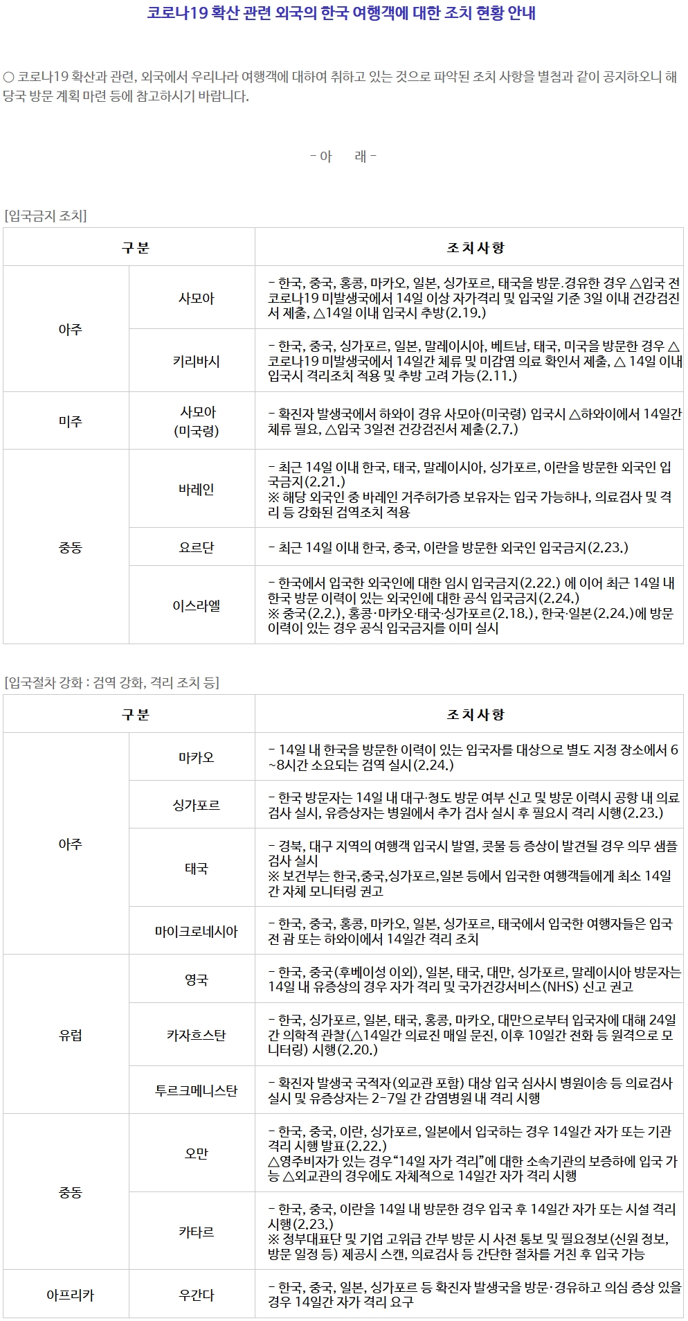 물론, 우리나라도 입국 검역에서 증상이 있으면 내외국인 모두 격리하고 검사하는 조치를 하고 있습니다만, 예상도 못 한 검역, 격리 조치를 받으실 수 있기 때문에 주의가 필요합니다.