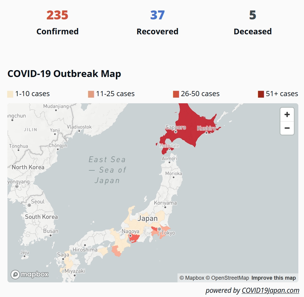 https://m.yna.co.kr/view/AKR20200228187500073 https://www.nikkei.com/article/DGXMZO56188700Y0A220C2L41000/ 주민들이 주말에 집에 머물기를 요구했습니다. 일단 긴급 사태 기간은 3월 19일까지라고 합니다. 아베 총리 입장에서는 마음에 안 들 수도 있을 것 같습니다만... https://www.yna.co.kr/view/AKR20200228126851073 도쿄마라톤, 3월 1일 강행…레게세 "코로나19, 기도할 수밖에" https://m.yna.co.kr/view/AKR20200228181500007 이탈리아 사태 초기에 마라톤에서의 전파 얘기도 나왔었는데... 1