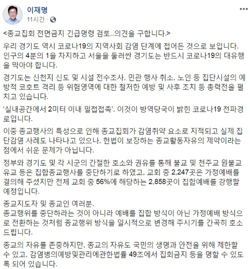 이 지사는 “종교집회를 강제금지할 경우 엄청난 반발과 비난이 예상된다”면서도 “그러나 도민께서 제게 맡긴 일 중 제일은 공동체의 안전을 지키는 것”이라고 강조했다. 이어 그는 “불가피한 반발을 이겨낼 수 있도록 권한을 준 것이므로 비난은 그 권한에 상응하는 책임의 일부로서 제가 감수하겠다”고 밝혔다. 마지막으로 이 지사는 “이번 주말 상황을 지켜본 후 경기도내 종교집회 금지명령을 심각하게 고민하겠다. 종교인을 포함한 많은 분들의 조언과 제안, 비판을 바란다”고 했다.