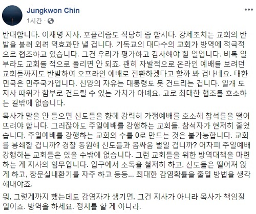 진 전 교수는 “기독교의 대다수 교회가 방역에 적극적으로 협조하고 있다”면서 “그건 우리가 평가하고 감사해야 할 일”이라고 지적했다. 이어 “비록 일부라도 교회를 적으로 돌리면 안 된다. 괜히 자발적으로 온라인 예배를 보려던 교회들까지도 반발해 오프라인 예배로 전환하겠다고 할까 봐 겁난다”면서 “대한민국은 민주국가”라고 강조했다.