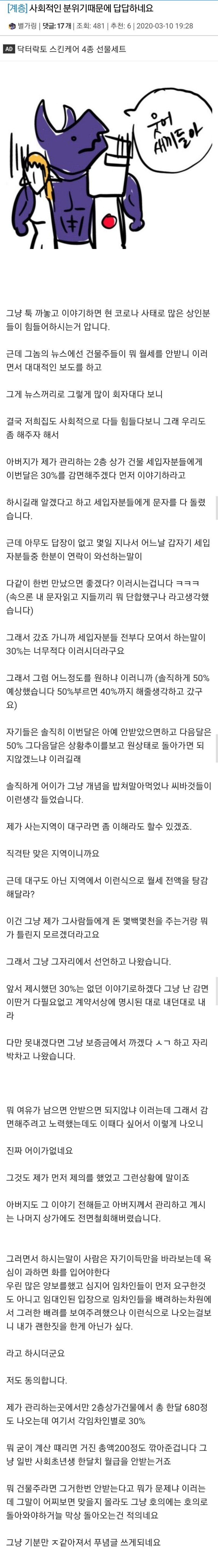 영업중단이 쉽냐.. 임대료랑 대출금 카드값 상환기간은 막아주고 명령내리는거냐.. 사장이 죽는게 전염병 확산을 막는데 더 효과적이겠다 대책없이 문닫아서 버틸 수 있는 가게가 몇이나 된다고.. 생활비를 주는건 못해도 장사 못하는 동안 돌아오는 비용처리는 미뤄주기라도해야..