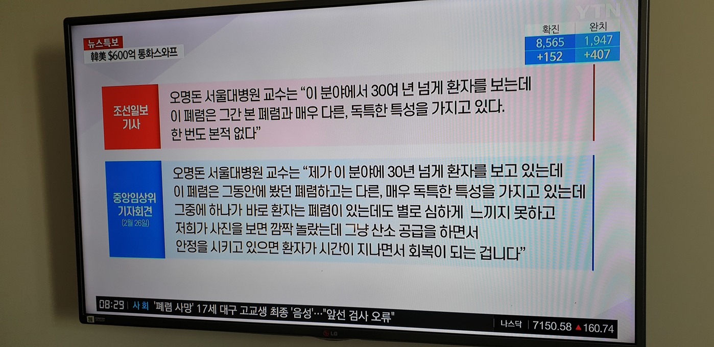 https://news.v.daum.net/v/20200320051913397 이번에도 또 조선일보가 코로나 관련 가짜뉴스를 살포했습니다. - 자신들이 인용한 발언을 한 취재원인 병원 교수에 대한 취재는 아예 있지도 않았고 - 두 가지 임상 사례를 하나의 사례처럼 엮어서 날조하고 폐가 변하는 현상이 대부분의 폐렴에서 나타나는 증상인 것은 누락하고 - 연구 결과 중 자연스러운 회복 같은 긍정적인 부분이나 수치에 대한 부연설명 등은 의도적으로 배제하였더군요. 잘못된 사실로 사람들이 공포에 떨든 말든 허위사실까지 살포하는 것을 서슴지 않는 뒤틀린 심성은 참 초지일관이다 싶습니다. - The xian - 1