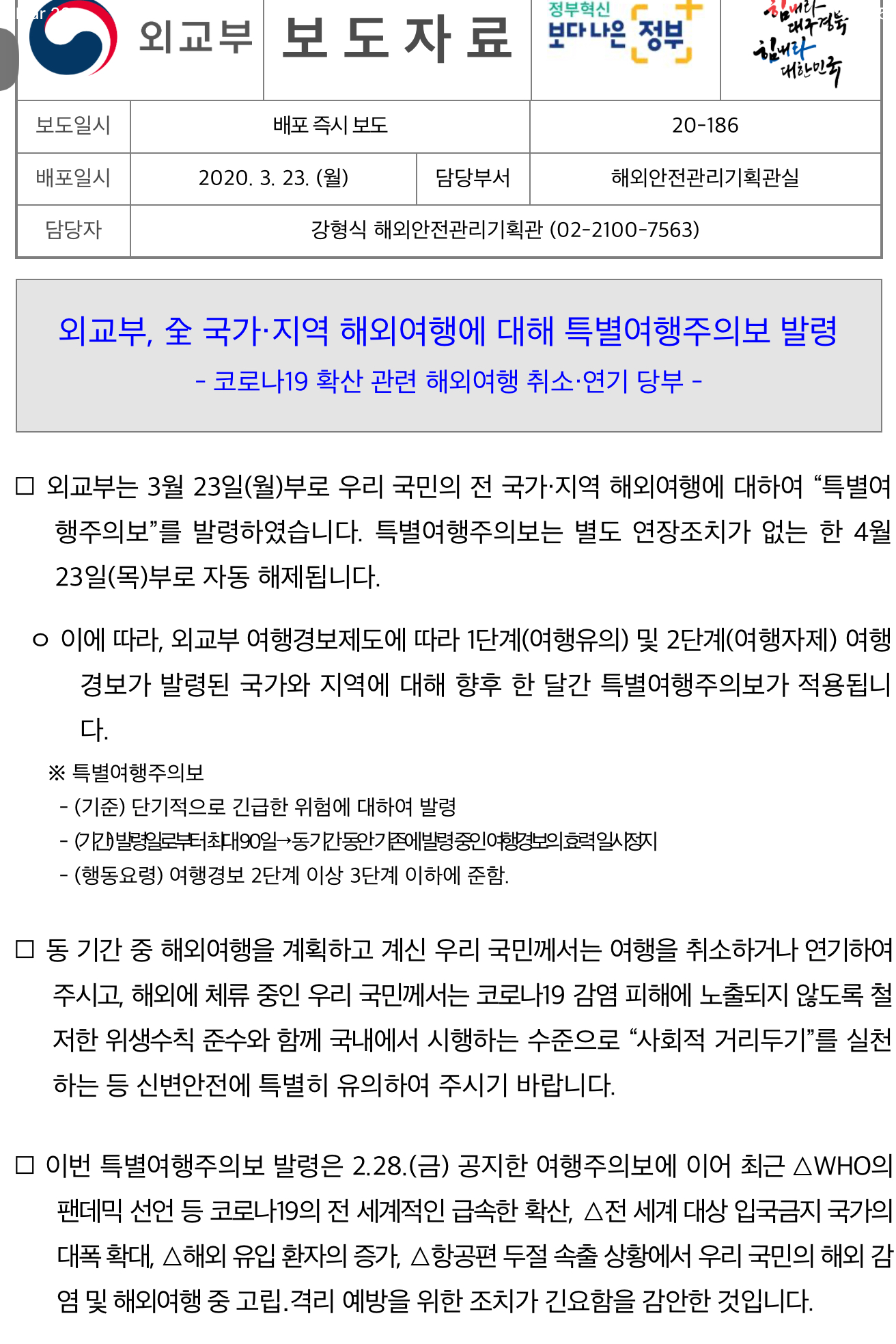 사회외교부, 전세계 특별여행주의보…여행취소·연기 당부 |